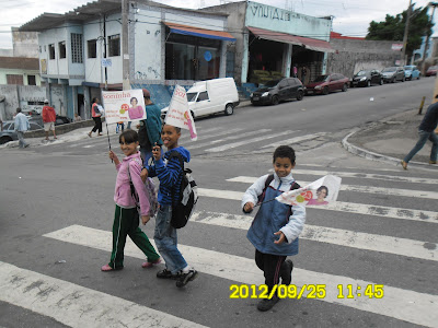 uma voz diz ..." Nossa, ela anda sem cordão de segurança ?" outra voz responde... " Essa é a Soninha Francine, não é esses outro que tem medo de gente como a gente. " Esse diálogo, eu, Rosângela Matos (jornalista), ouvi ao meu lado, no momento desta foto, em Vila Teresinha no Bairro de Brasilândia em São Paulo dia 25.09.2012 às 11h40min. |